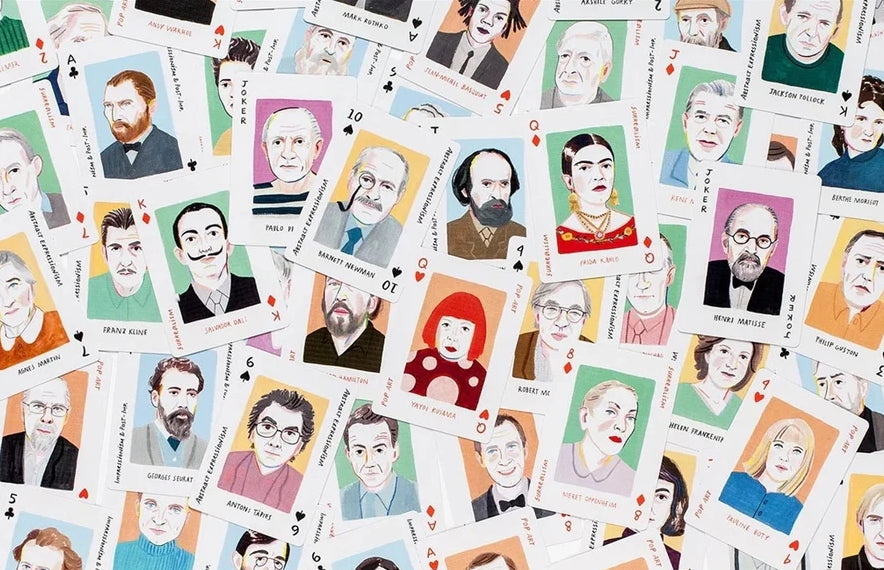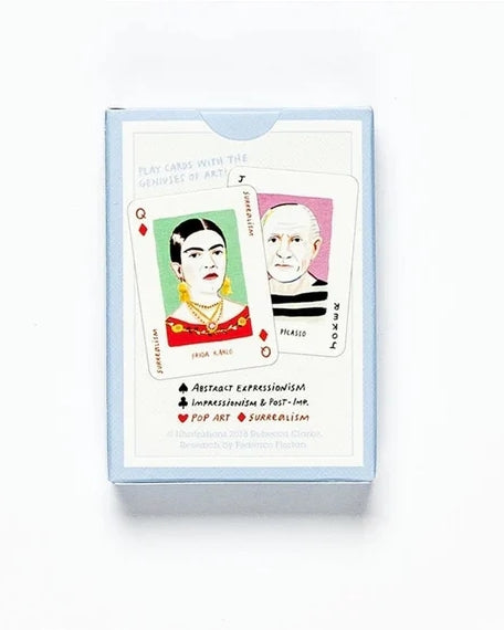 - Cards are categorized into four art movements and suits: Pop Art as hearts; Impressionism/Post-Impressionism as clubs; Abstract Expressionism as spades; and Surrealism as diamonds.