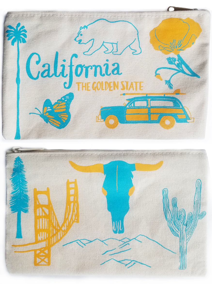 The California Pouch reflects the wonderful motifs of the Golden State. Great size for makeup, pencils and all those important bits you need to keep safe or take with you on the daily go.