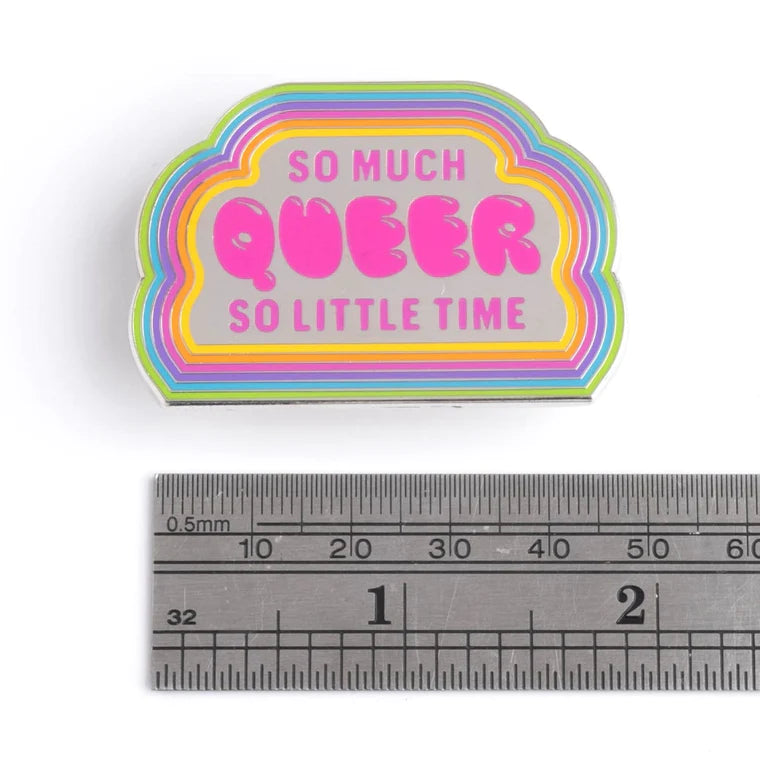 So Much Queer, So Little Time pin is a collaboration with Lady Justice Brewing, a community-focused brewery dedicating time, space, and money to nonprofits and community partners that support and empower women and girls in the state of Colorado. Art for this pin was created by Richard LaRue.