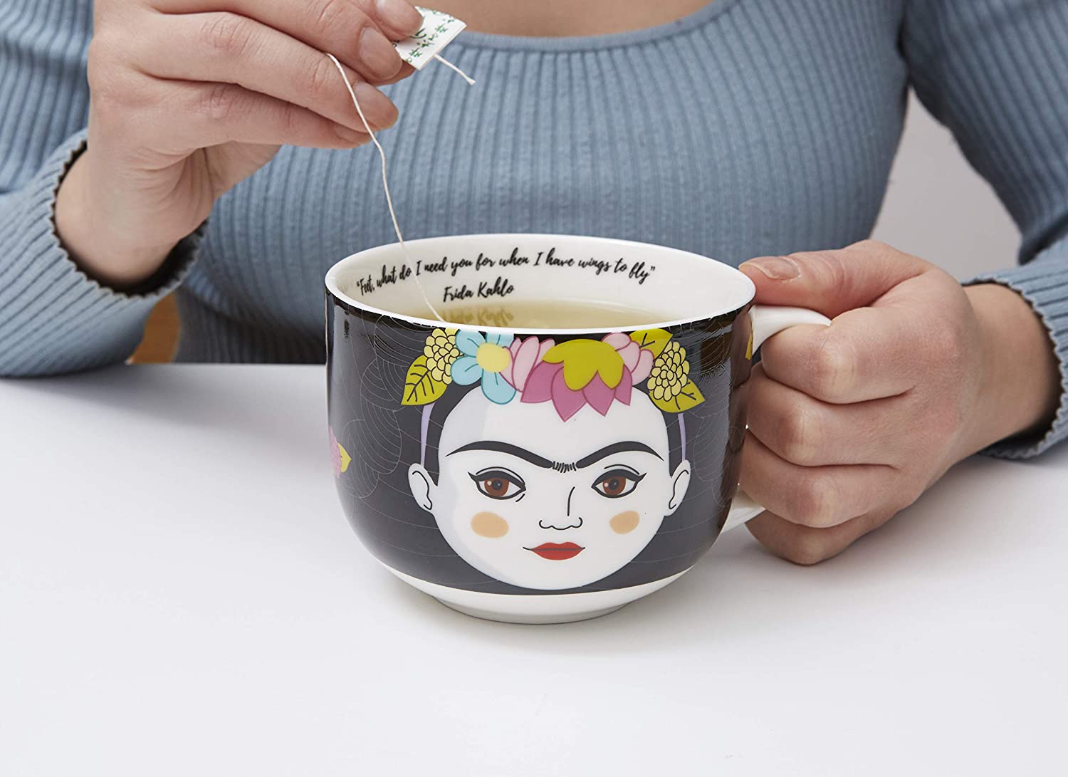 Whether it’s for coffee, tea or soup, this wide-mouth and large handle mug makes it easy to enjoy any beverage of choice. With every sip you’ll enjoy the inspirational quote inside the rim. "Feet, what do I need you for when I have wings to fly" - Frida Kahlo. Beautifully illustrated by Hector Serrano.