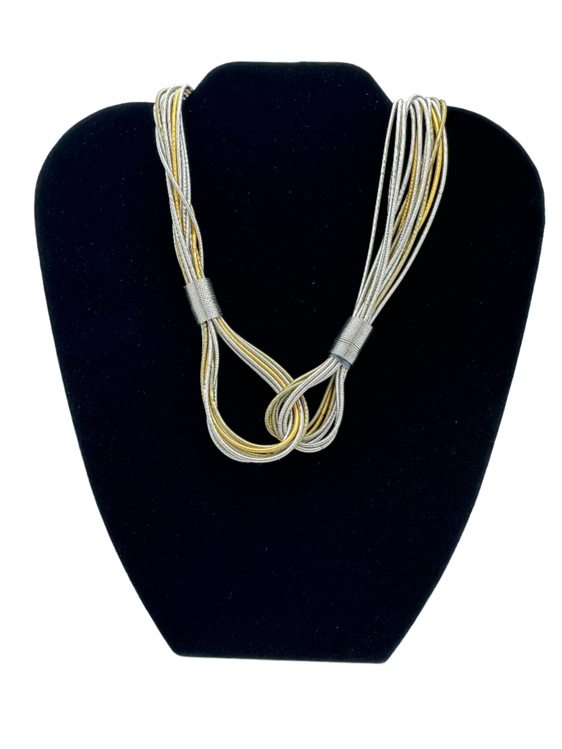Based out of Atlanta, Georgia Sea Lily offers this beautifully handmade necklace featuring their iconic piano wire and heavy-duty magnetic clasp. This piece has silver and gold mixed wire and features a loop locked by a silver wire spring.