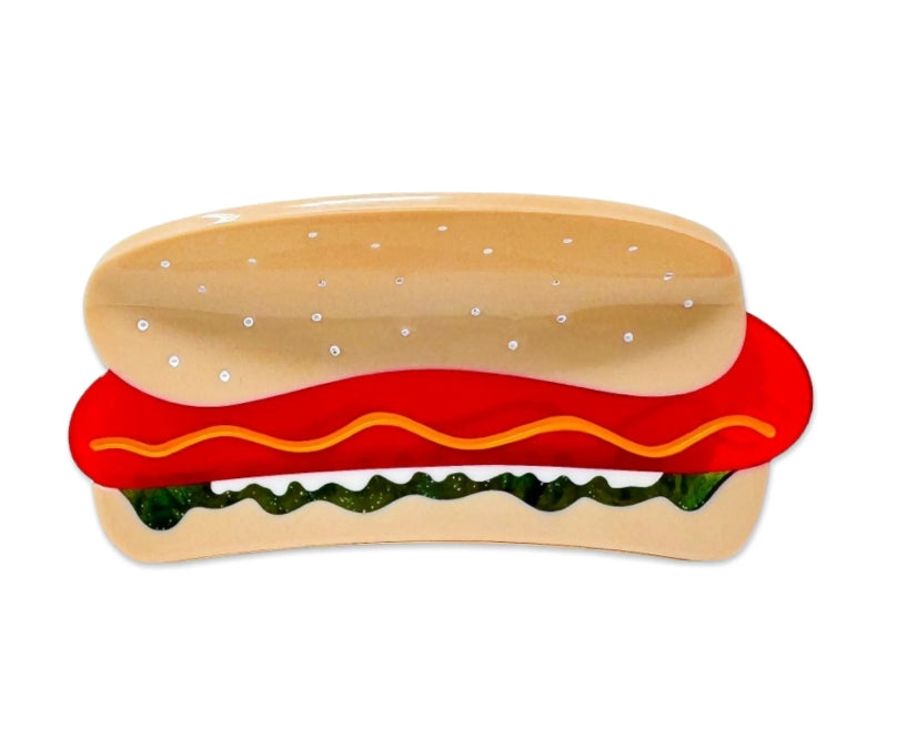 Meet our Hot Dog Hair Claw – now with all the fixins! Whether you’re into a classic Chicago dog or your own quirky twist, this playful claw is crafted from cellulose acetate, a plant-based alternative to plastic. Measuring 4" x 2", it adds a deliciously fun touch to your hairstyle. Embrace the tasty details and flaunt your unique style with this one-of-a-kind accessory!