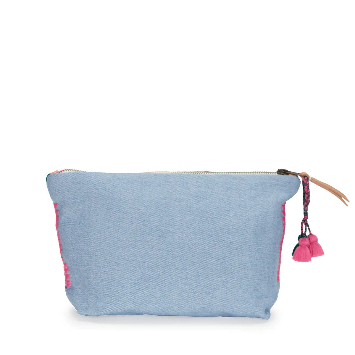 Featuring upcycled denim, water-resistant lining, and leather zip pull with accent pom poms.