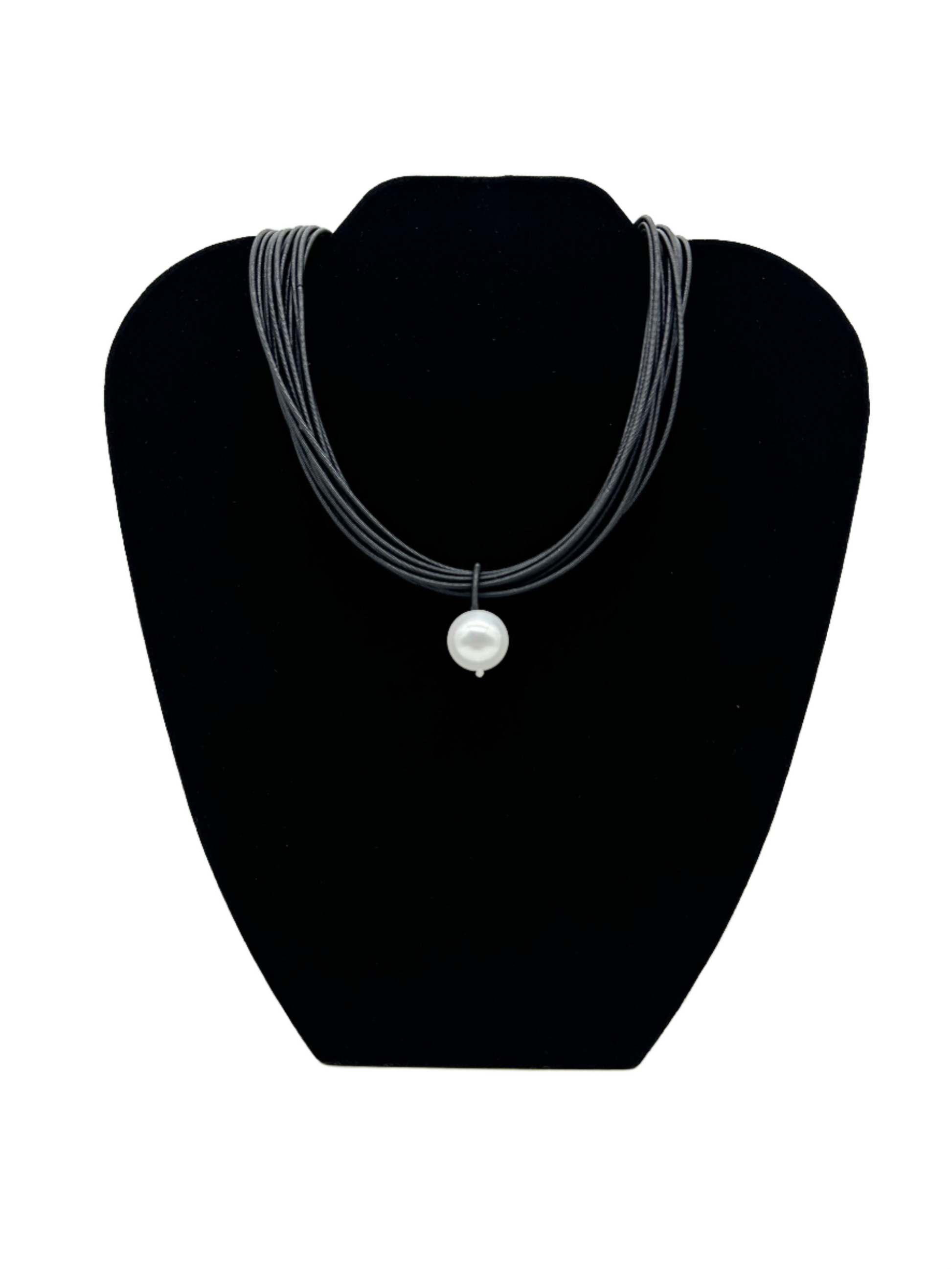 Based out of Atlanta, Georgia Sea Lily offers this beautifully handmade necklace featuring their iconic piano wire and heavy-duty magnetic clasp. This piece has black wire stands accented with a centered pearl pendant.