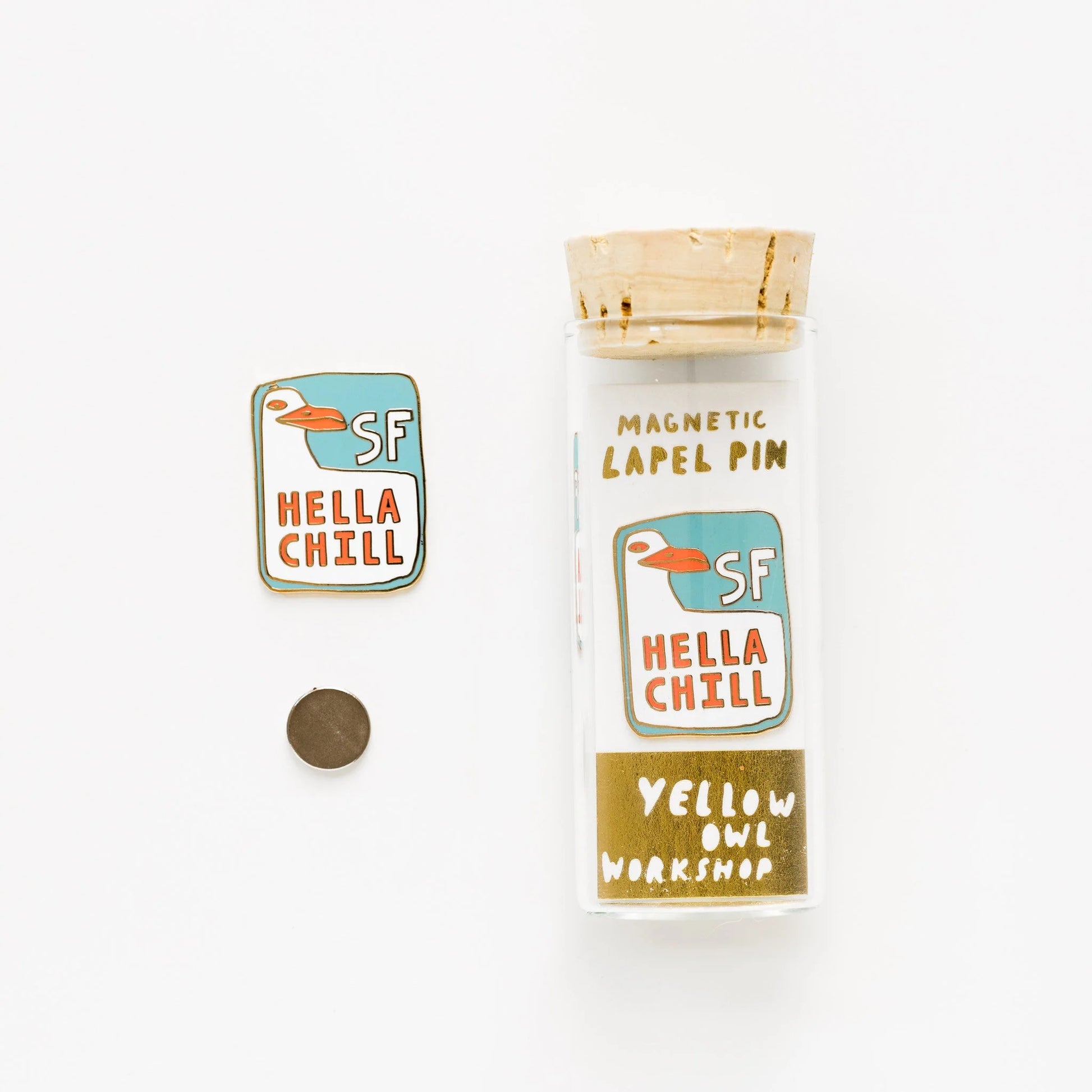 San Francisco based Yellow Owl Workshop's luxury-quality 22-karat gold gilt lapel pins are decked with vivid cloisonné colors and have a magnetic backing. Delicate enough (and damage-free!) for your favorite tops but with magnetic strength that allows them to be worn on even heavy-weight denim. Comes packaged in a unique glass vial packaging with cork.