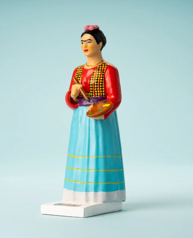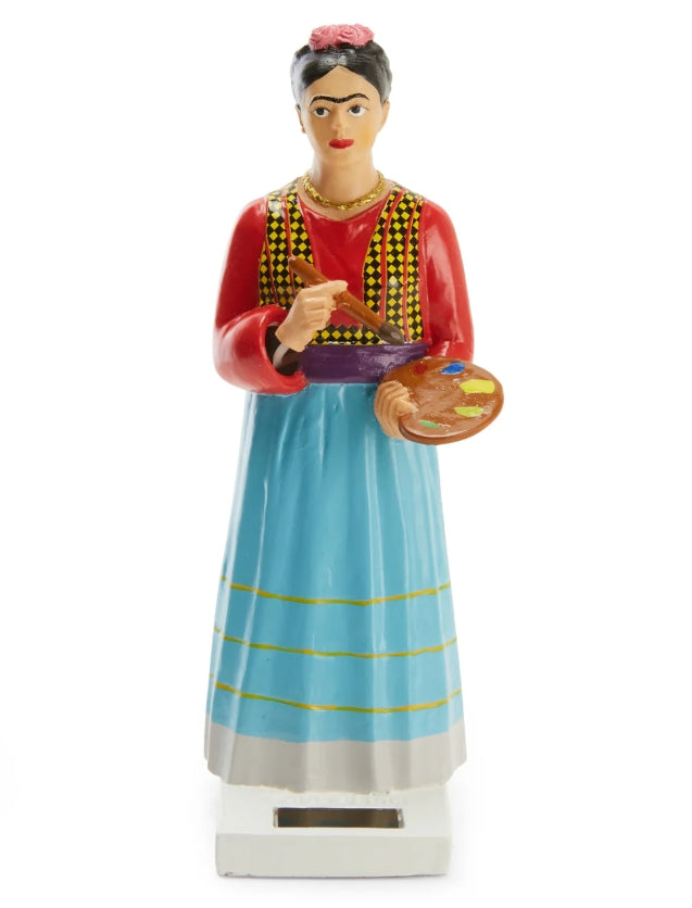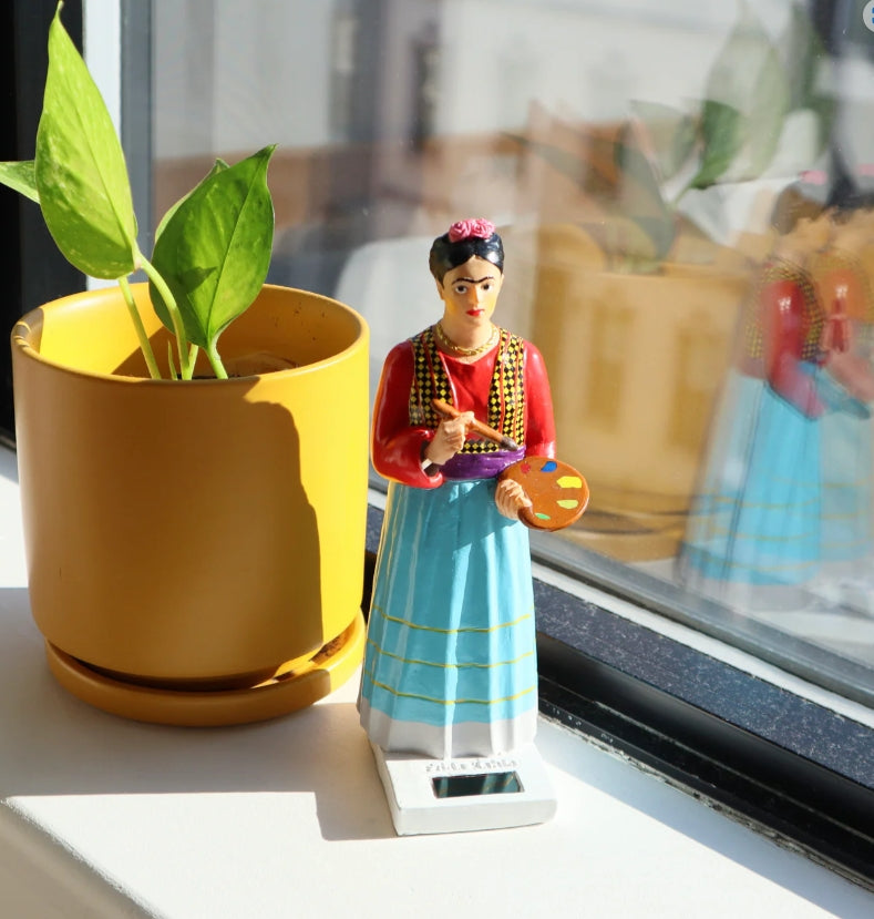 Frida Kahlo was a renowned Mexican artist known for her vibrant artwork depicting her struggles, emotions, and identity. As our hand-painted Solar Frida gestures to her palette, we are reminded of her inspiring legacy and creativity. Place her on your windowsill to add a touch of charm and uniqueness to your windows and indoor spaces!