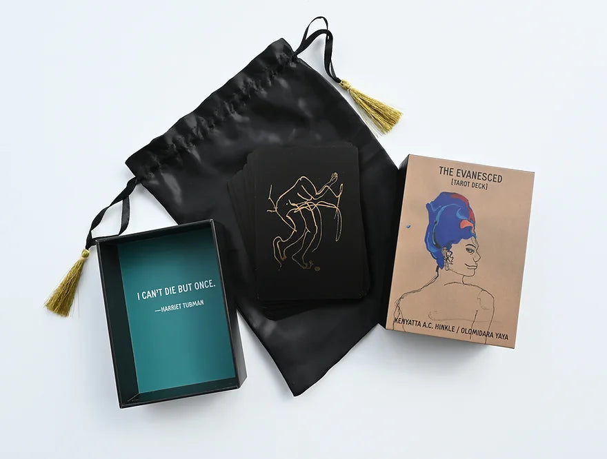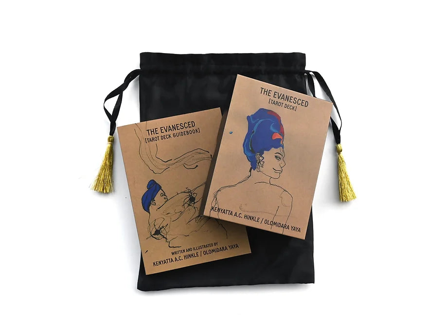 The Evanesced [Tarot Deck] is inspired by The Evanesced Series, an expansive body of work channeled by artist Kenyatta A.C. Hinkle a.k.a. Olomidara Yaya. Through 100+ drawings and paintings that Hinkle/Yaya calls un-portraits and a suit of site-specific performances, she/they are creating a body of work that interrogates the erasure of Black womxn historically and presently. This deck and its creation stand in solidarity with various intersections of what it means to be femme, especially Black and femme, and is in conversation with the #SayHerName movement. All un-portraits featured in the deck are from The Evanesced: The Untouchables (2020) commissioned for the traveling exhibition The Black Index, curated by Bridget R. Cooks.