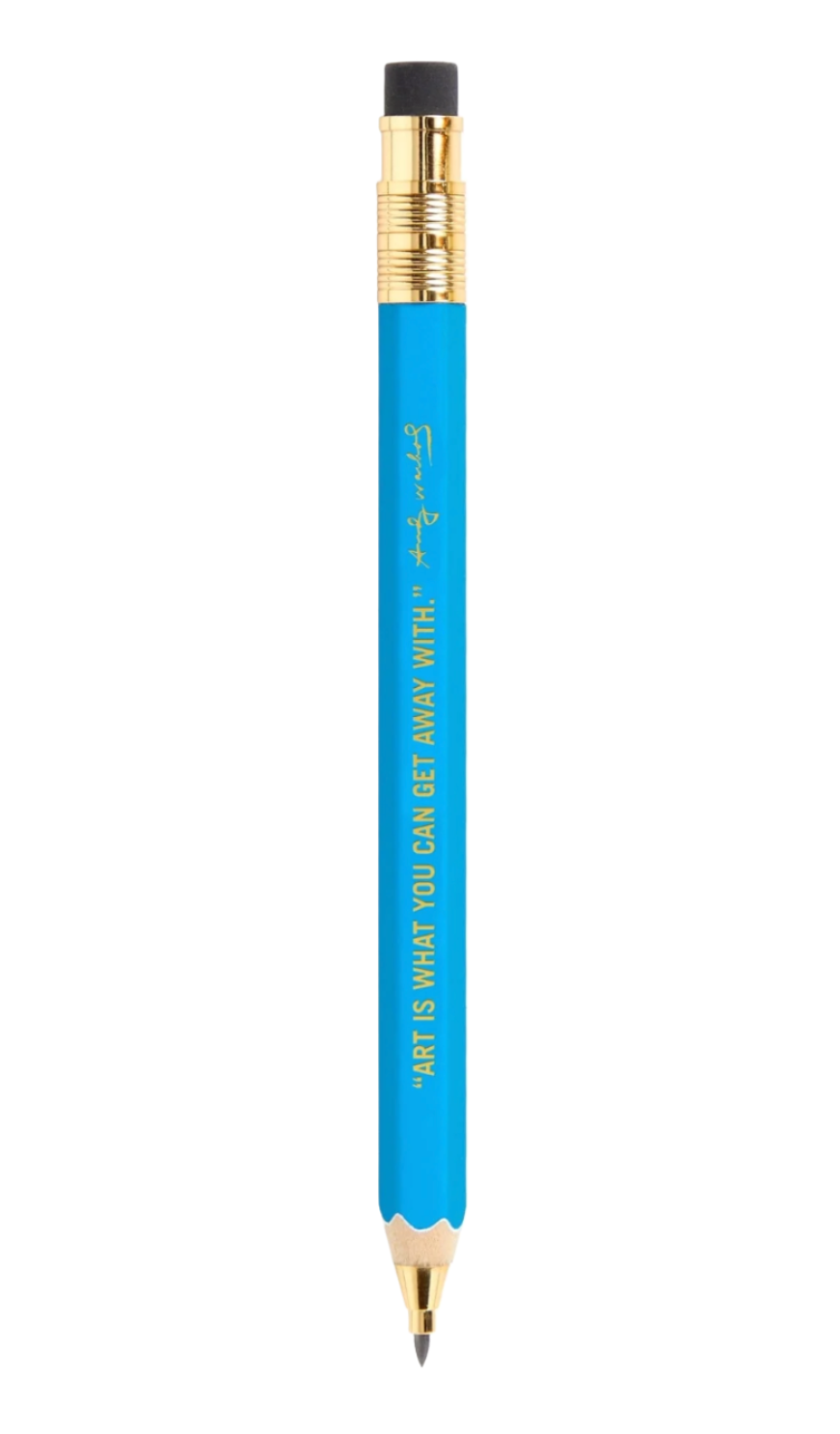 This Warhol Philosophy Mechanical Pencil features his famous quote “Art is what you can get away with” in gold foil. It is packaged in a sturdy, black, windowed reusable box. The pencil uses a 2mm HB lead. The pencil lead and erasers are both refillable.